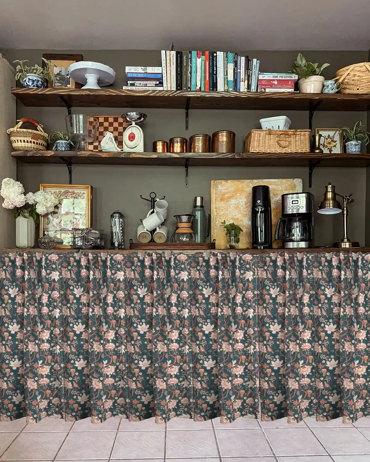 Before I can commit, I need to check out some organic patterns. You know, maybe less hard-line stripes and plaid, and try some florals. When you have alot of hard lines, like I do with the upper and lower shelves, even the floor, adding some organic patterns can create a more visually interesting space.