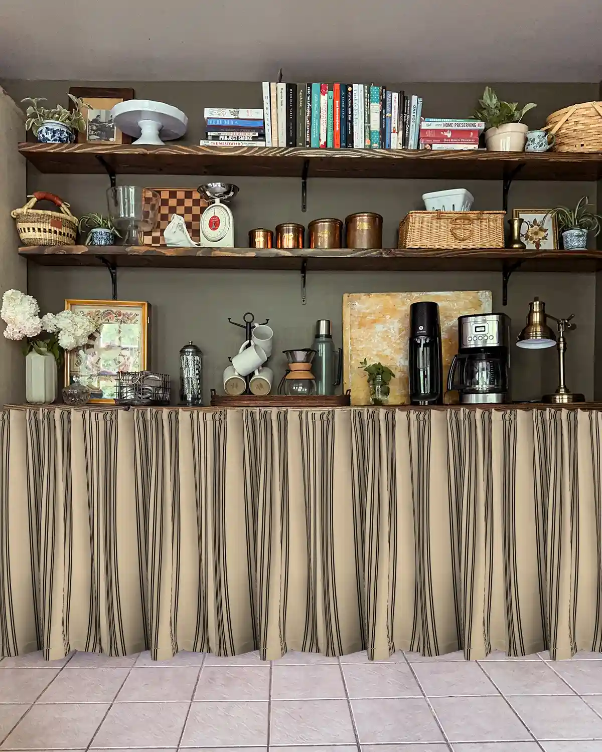 The next stripe is the Rustic French Ticking Stripe Curtain in Light Blue from Spoonflower. Now we’re talking! I could get behind this and am considering this fabric option a strong contender for cafe curtains. I also don’t hate them (as much) paired with our floors. Maybe with a deep scrubbing and lightening the grout, the pantry zone wouldn’t look so bad.