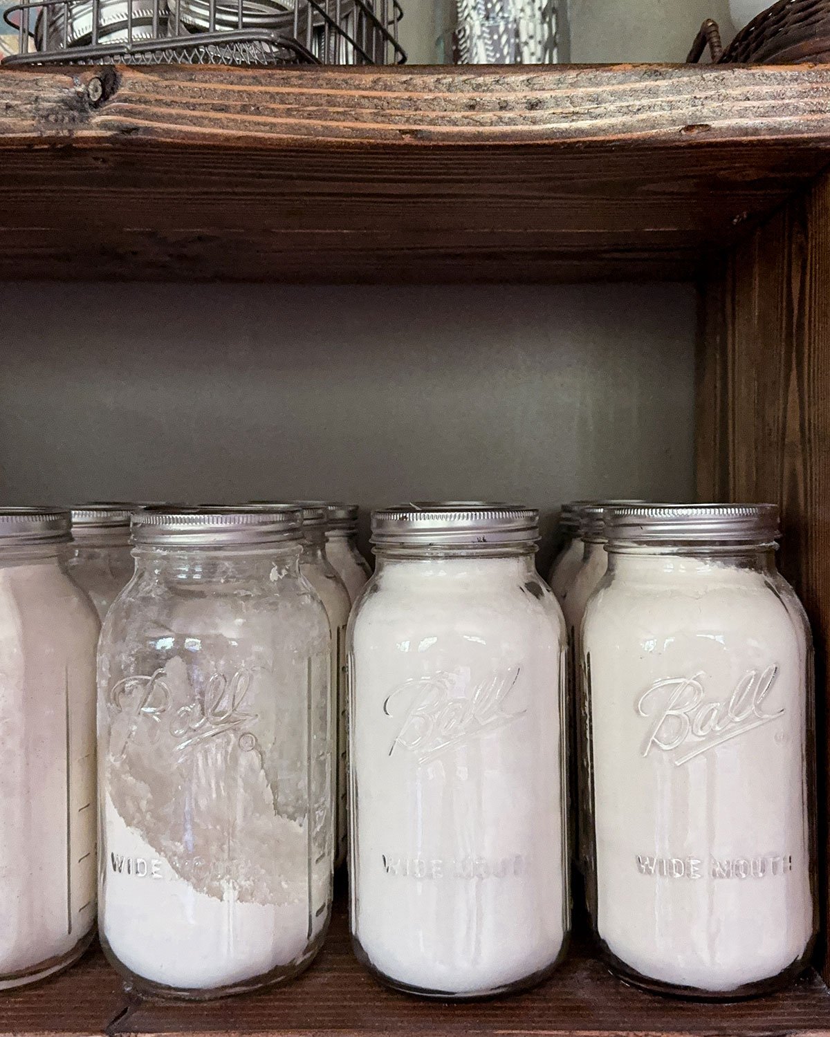 I had this vision while we were designing the shelves of all our dry goods stored in clear containers. I already have and use so many 64-oz Ball jars, so we custom-designed the shelves to fit six of those jars wide and three deep. It looks so good when the shelves are filled up.