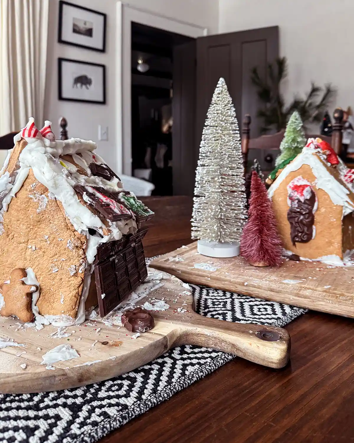 Making gingerbread houses is a must-do in this house. It’s such a blast! Typically, I make our own using gingerbread house cutters along with King Arthur’s construction gingerbread recipe. The girls and I go shopping for a few candies, each of us gets to choose two, and we share. Then it’s a free-for-all. I’ll help them assemble the houses, but they mainly decorate them on their own these days.