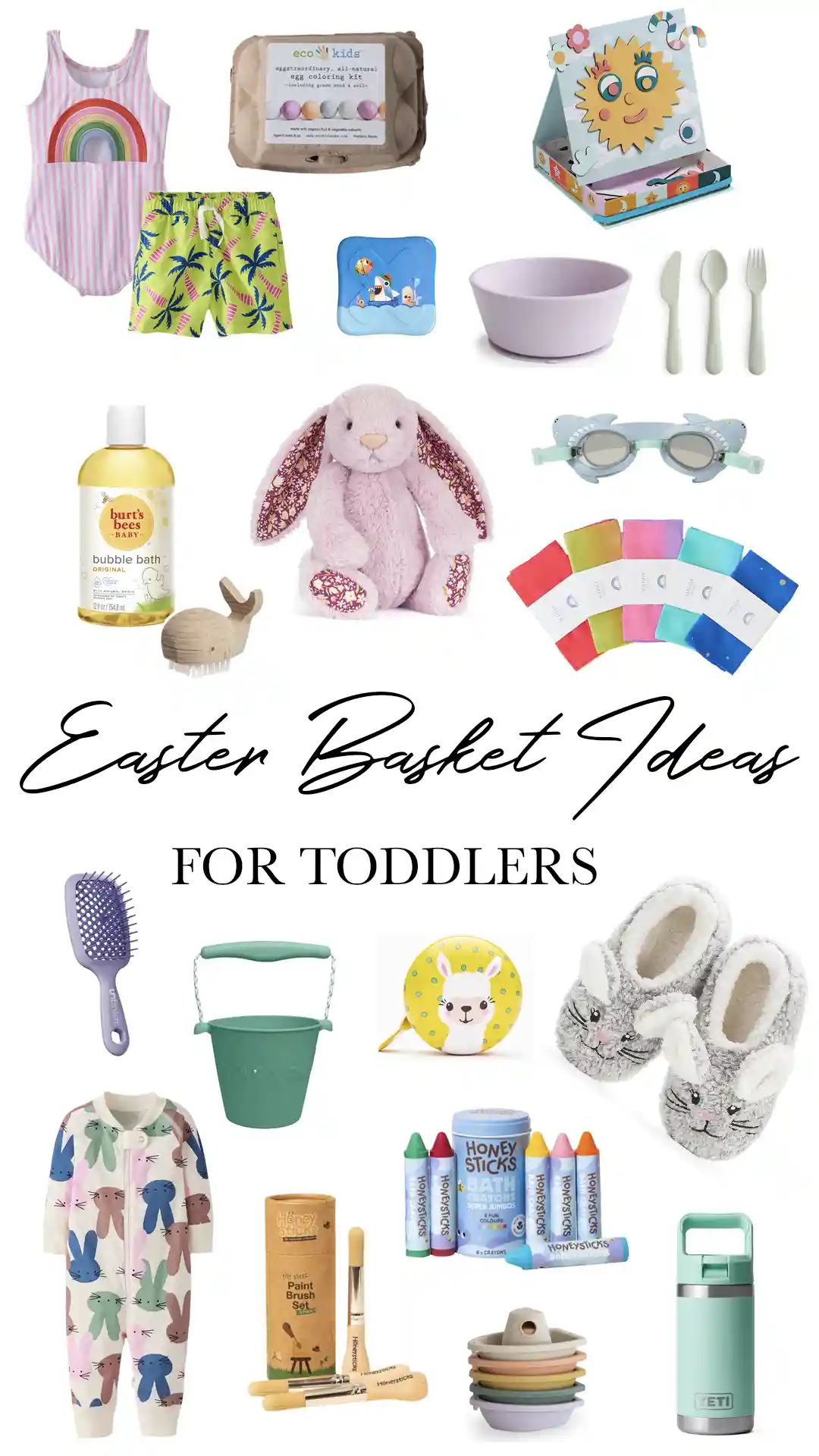 Sources: Pink Striped Bathing Suit (Hanna Andersson), Swim Trunks (Hanna Andersson), Egg Dying Kit (Bella Luna Toys), Ocean Friends Bandages (Welly), Face-Making Toy (Manhattan Toy), Suction Bowl (Mushie), Cutlery Set (Mushie), Shark Goggles (SunnyLife), Playsilks (Sarah’s Silks), Pink Bunny (Jellycat), Bubble Bath (Burt’s Bees), Wooden Whale Nail Brush (Bella Luna Toys), Detangling Hair Brush (Target), Bunny Sleeper (Hanna Andersson), Scrunch Bucket (Bella Luna Toys), My First Paint Brush Set (Bella Luna Toys), Llama Bike Bell (Amazon), Bunny Slippers (Amazon), Jumbo Bath Crayons (Bella Luna Toys), Bath Boats (Mushie), Water Bottle (Yeti)