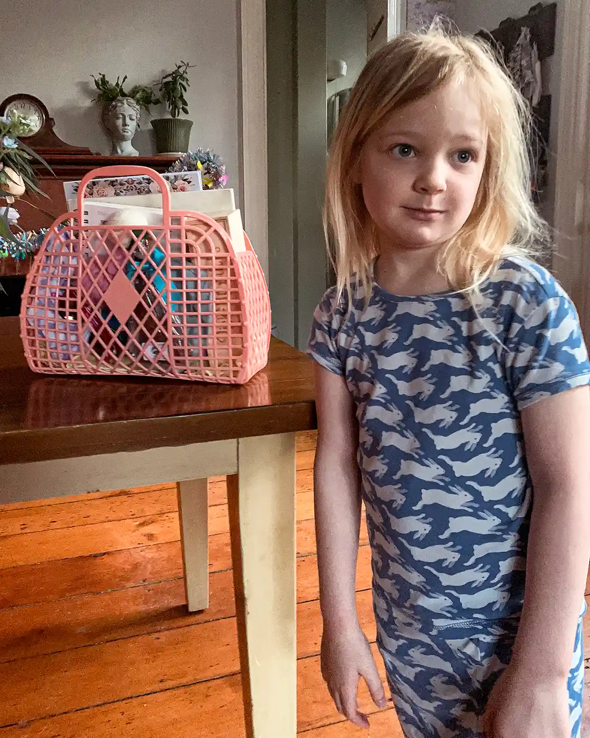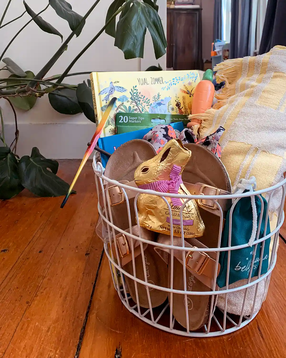In Rowan’s Easter basket: Beach towel, bathing suit, sandals, Big Book of Belonging book, It’s Not Easy Being a Bunny early reader book (she’s learning to read!), jacks, wooden memory game (her favorite), bubbles, chocolate bunny, and markers.